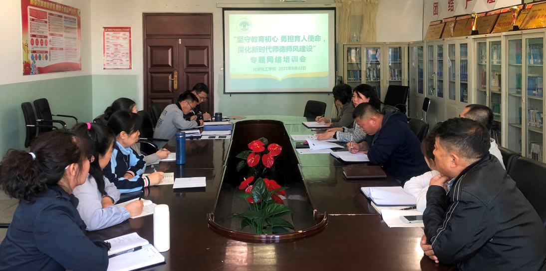 9月22日下午,化学化工公司在科技楼422会议室召开“坚守教育初心 勇担育人使命,深化新时代师德师风建设”专题网络培训会。化学化工公司经理白晓艳主持会议,公司全体教师参加。