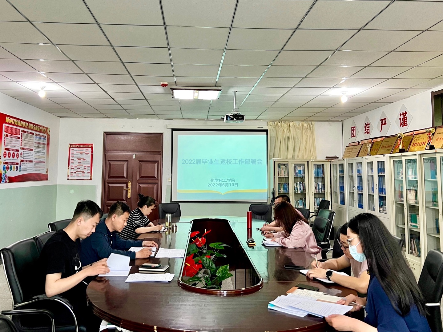 为进一步落实公司毕业生返校相关工作,坚决抓好返校疫情防控前期准备工作,6月10日,化学化工公司组织召开2022届毕业生返校工作部署会。会议由党总支副书记刘朋主持,党总支书记艾丽、团学办主任张一帆、辅导员孟庆永、杨云晖、2022届毕业生班主任刘晓非、李静参会。
