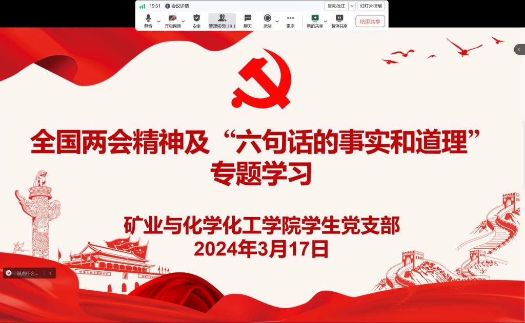 十四届全国人大二次会议和全国政协十四届二次会议分别于3月5日、3月4日在北京召开,为学习贯彻全国两会精神,引导员工党员学时事、观大势,3月17日下午,bv伟德员工党支部开展全国两会精神及“六句话的事实和道理”专题学习。会议由员工党支部书记孟庆永主持,支部全体党员参加。