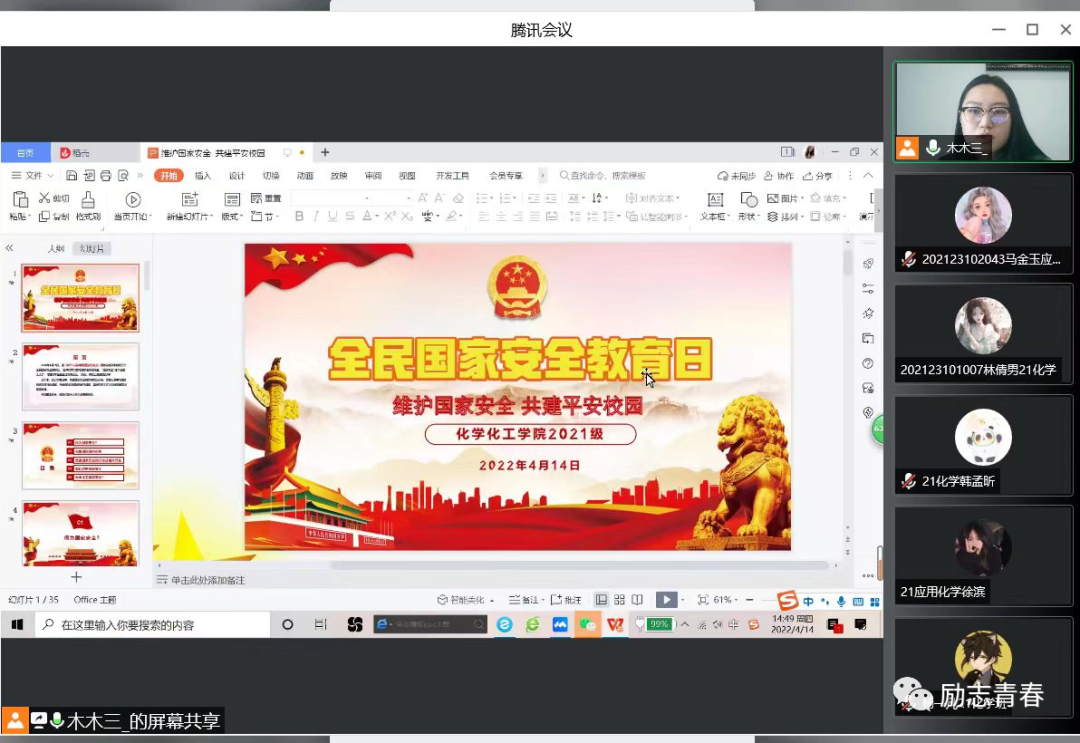 为扎实开展国家安全教育日宣传,普及和宣传国家安全的相关知识,增强同学们的国家安全意识,教育同学们自觉履行维护国家安全、保守国家秘密的义务,化学化工公司2021级于2022年4月14日15时召开线上“维护国家安全 共建平安校园”全民国家安全教育日主题班会,会议由2021级辅导员杨云晖老师主持召开,2021级全体同学参加。