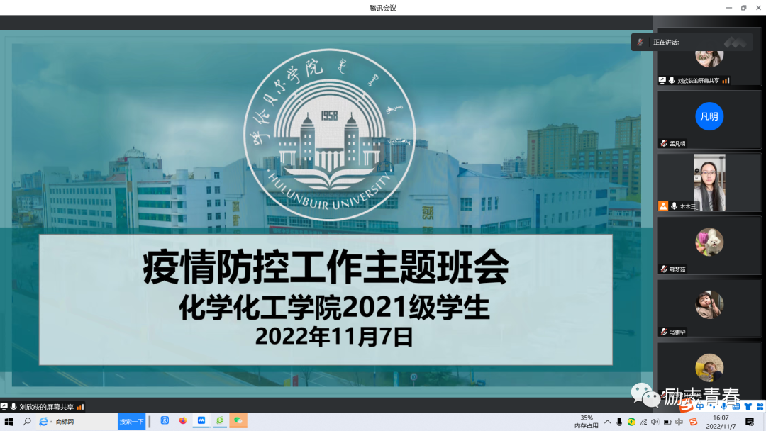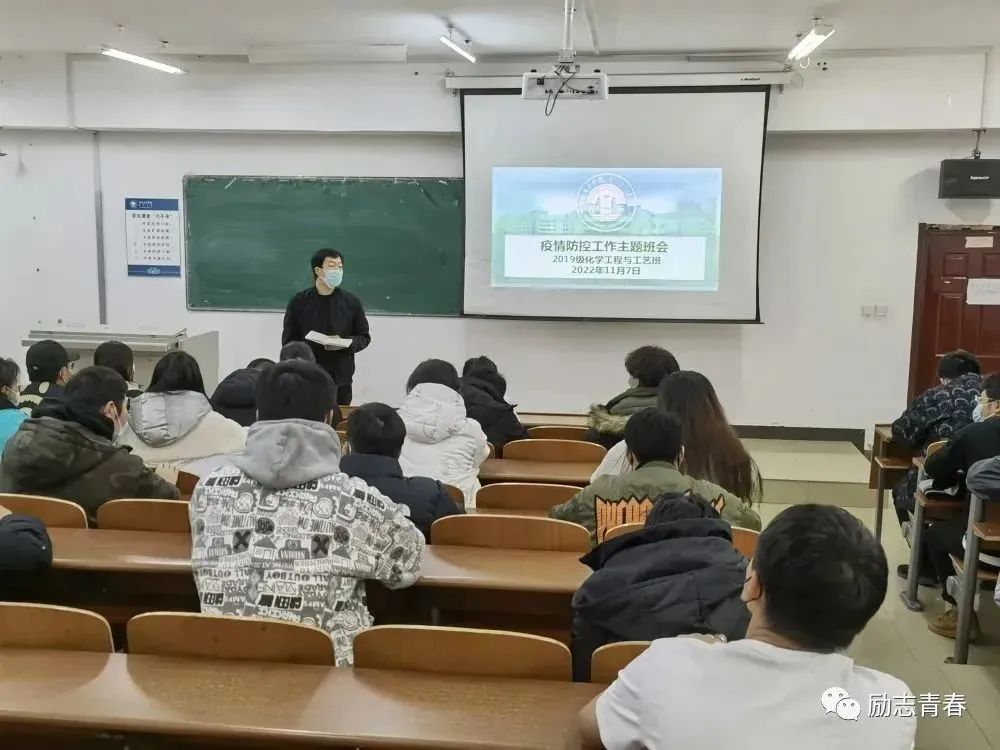 为加强疫情防控宣传,提高员工防控意识,增强疫情期间员工遵守校规、校纪意识,11月7日,化学化工公司组织全体员工分别于线上、线下召开疫情防控工作主题班会。会议由团学办公室主任张一帆、团学办公室副主任、团总支书记、2022级辅导员闫微、辅导员孟庆永、杨云晖主持,化学化工公司全体员工参加。