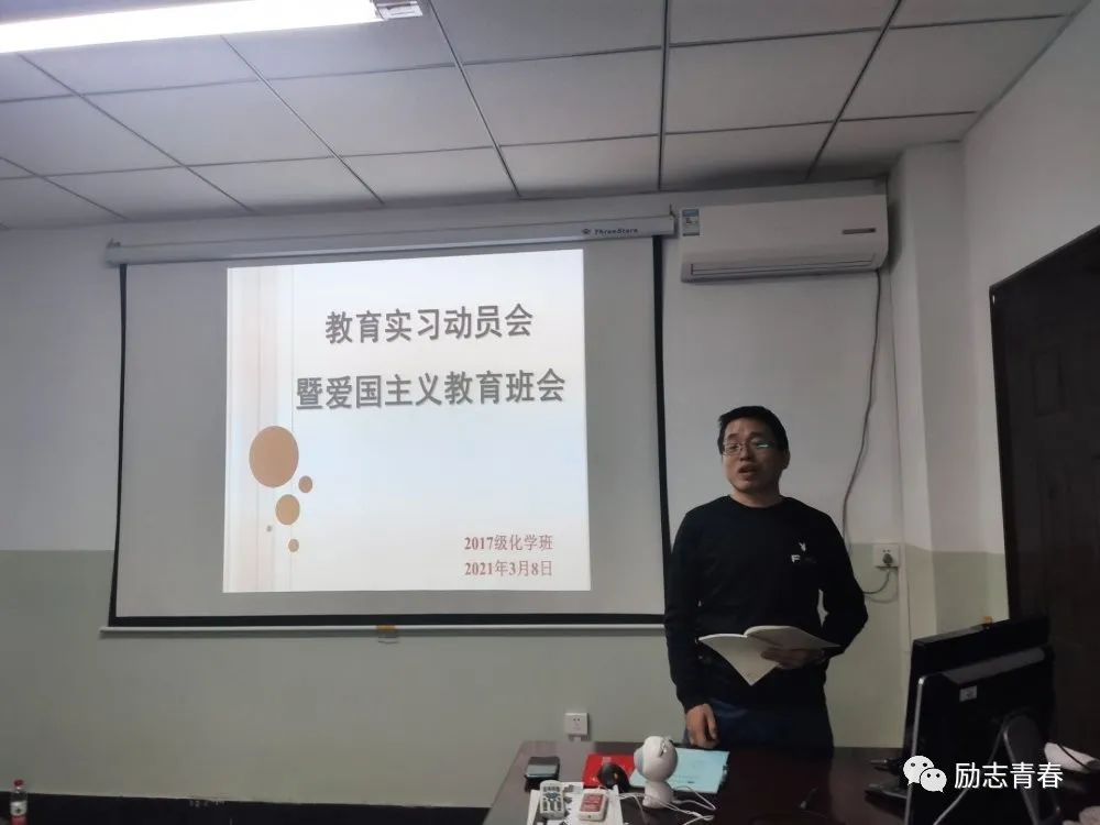 为进一步做好员工实习工作,引导员工做好实习前的各项准备,让同学们充分了解现在的就业形势,进一步开展深化员工的爱国主义教育,培养同学们的爱国热情,化学化工公司2017级化学班于3月8日在科技楼446室开展了“教育实习动员会暨爱国主义教育班会”,会议由班主任侴晓玉老师主持,2017级化学班同学参加会议。