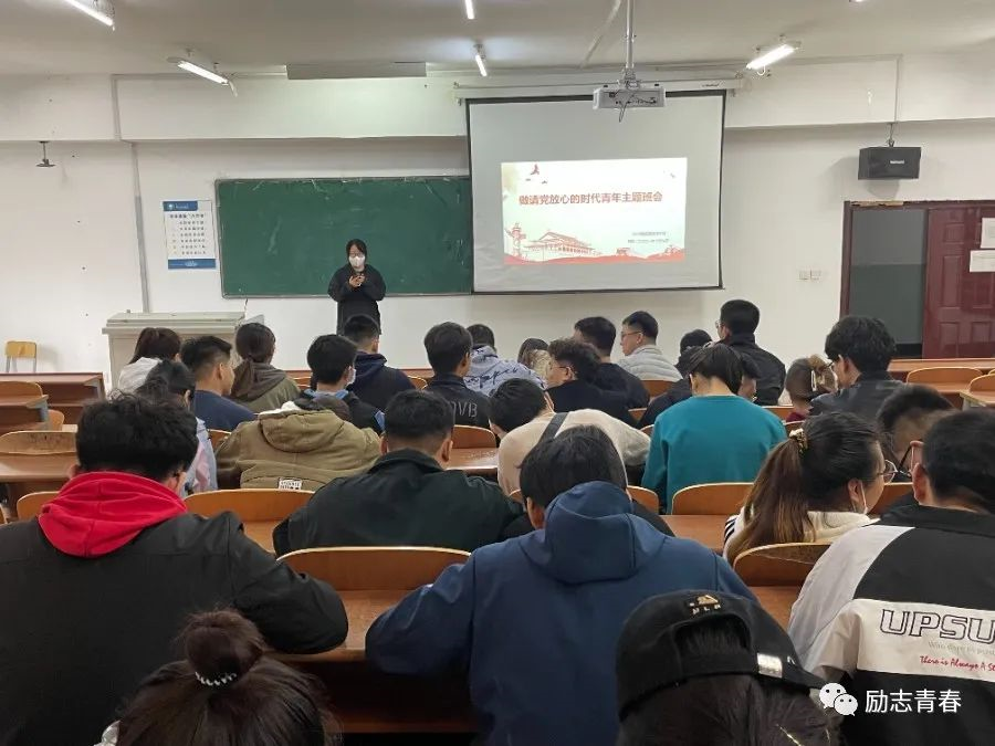 会上团支部书记杨阳明确本次班会主题内容,并领学习近平总书记重要讲话。之后由党员代表高悦、张杰分别做了《请党放心,强国有我》主题演讲。