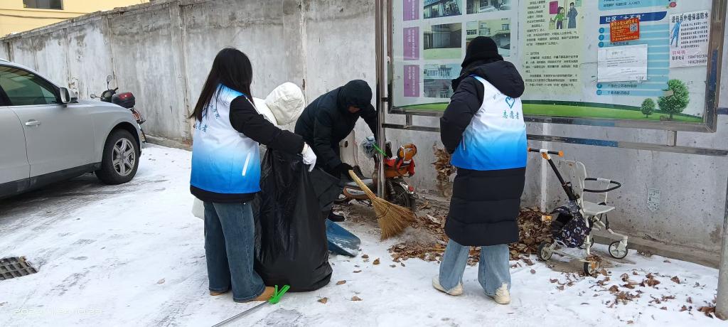 活动中,大家踏着白雪,抵着寒风,仔仔细细地清扫每一处,不论是电瓶车下的落叶,还是告示栏下的垃圾,都用扫帚和夹子一一除净,大家认真清理小区内外地面垃圾、树叶和杂草,争取不让一片落叶留在这美丽的家园中。