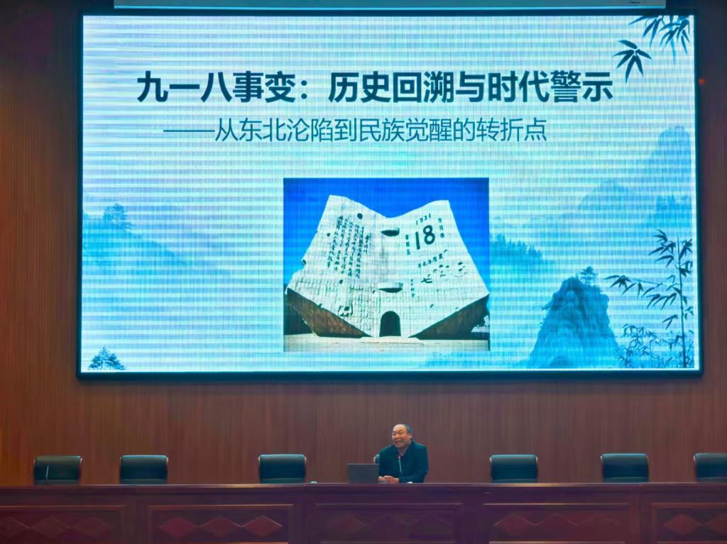 讲座现场氛围庄重,同学们始终保持专注,认真聆听讲解的同时,紧盯屏幕上展示的历史影像与文字史料,不时低头记录关键信息;当听到东北沦陷、民众受难等苦难历史片段时,不少同学神情凝重,深刻感受到那段历史的沉重与悲壮。黄福令老师以九一八事变为核心主线,清晰梳理历史脉络与现实关联:从1931年“柳条湖事件”爆发、日军蓄意发动侵略战争,到东北军奉行“不抵抗政策”仓促撤退、东北全境在短短4个月18天内沦陷的惨痛历程;从马占山率部打响江桥抗战、东北抗联将士历经14年浴血坚守的抗争壮举,到伪满洲国统治下东北民众遭受的残酷殖民压迫,每一个历史细节的呈现,都让同学们更直观地认识到民族曾面临的危机与苦难,更深刻地体会到抗争精神的可贵。