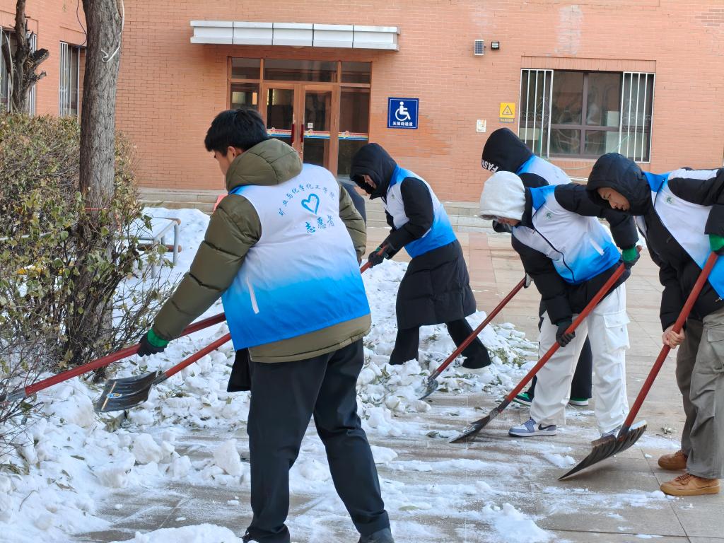 活动前,身着蓝白马甲的志愿者们迅速领取铁锹、扫帚等工具,在特教中心负责老师的统筹安排下,快速划分作业区域、明确分工。力气大的同学负责用铁锹铲除路面压实的冰层与厚雪,动作干脆利落;细心的同学手持扫帚,沿着通道细致清扫散落积雪,不留死角;还有的同学组成清运小组,将集中起来的积雪搬运至指定区域堆放。铁锹与地面的碰撞声、扫帚清扫的沙沙声交织在一起,在冬日的校园里奏响了温暖的奉献乐章。